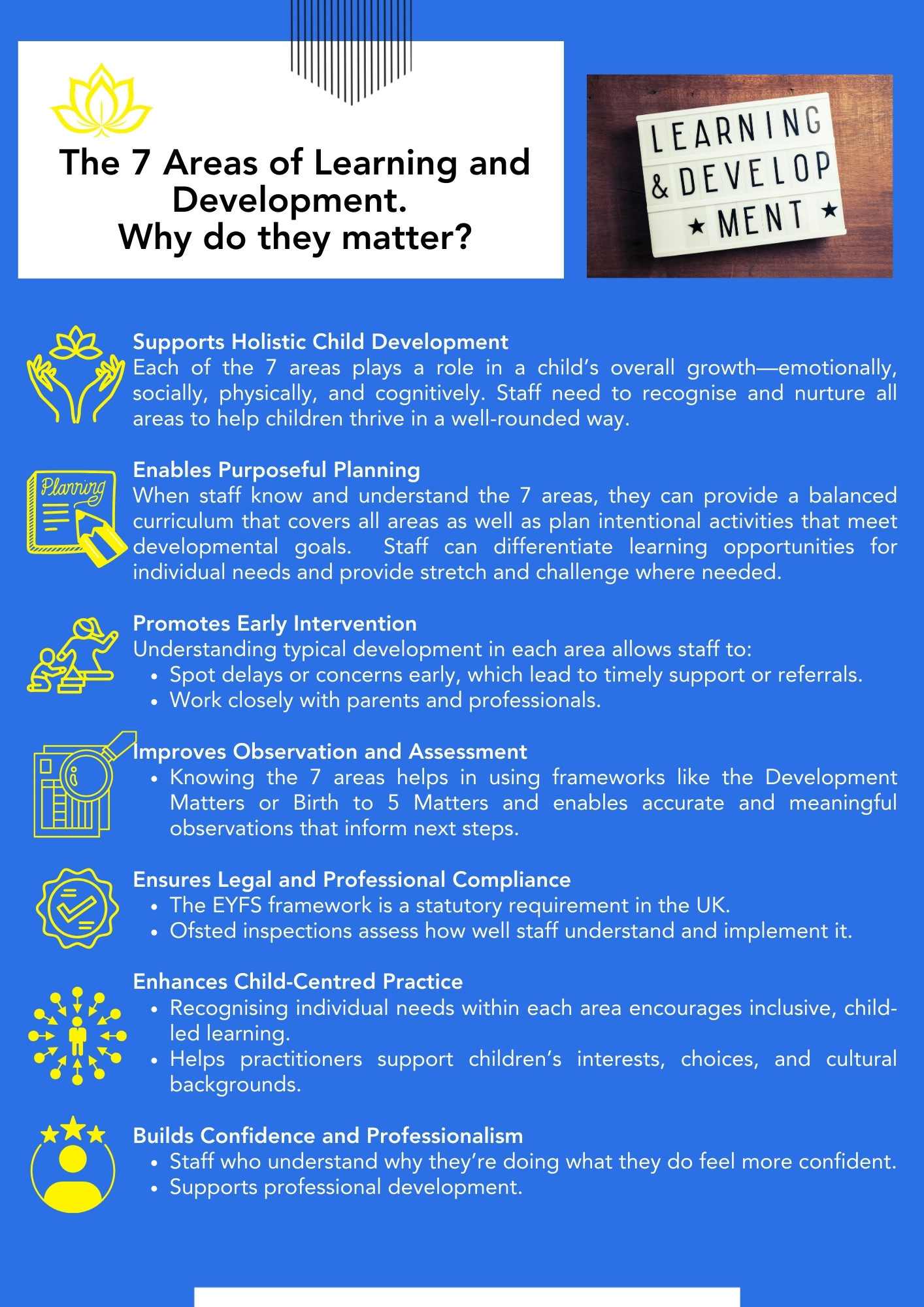 - Have staff that know and understand the 7 areas of learning and understand the areas of development.