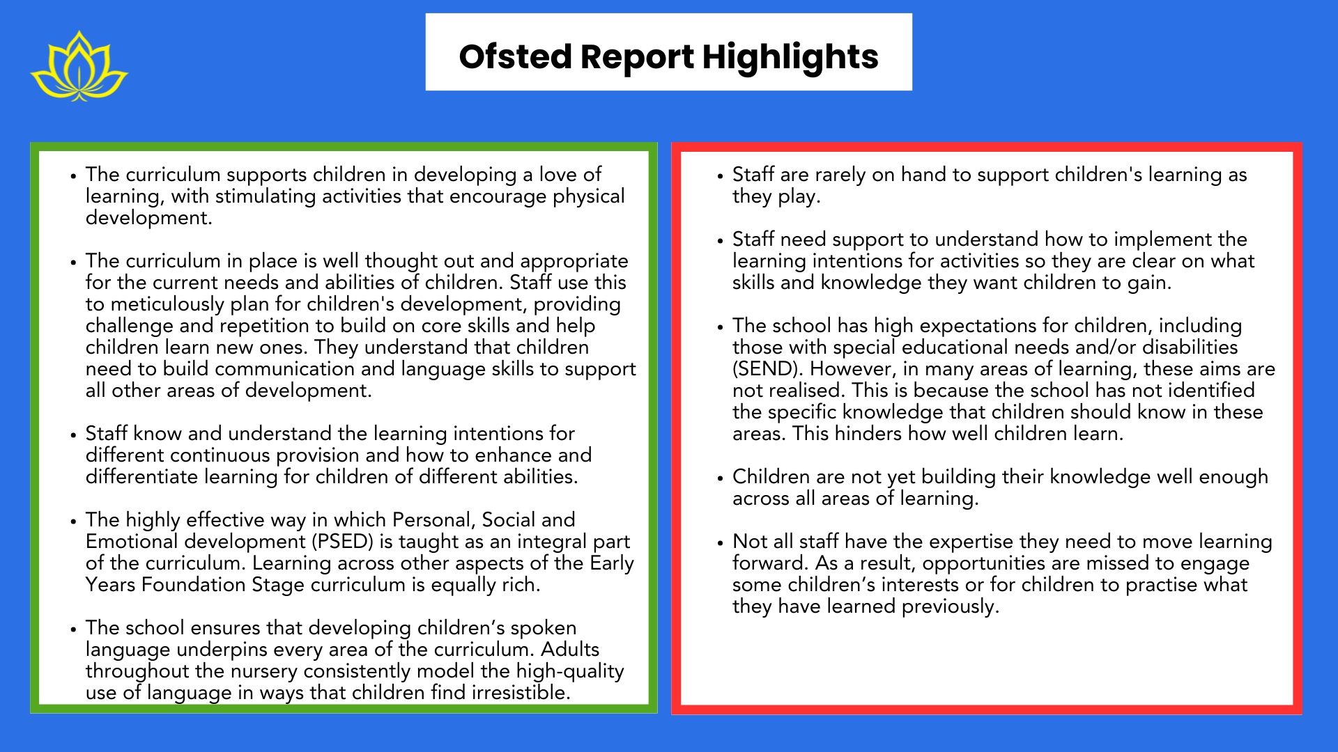 - Exemplary promotion of seven areas of learning in all they do which impacts all children in the whole setting.